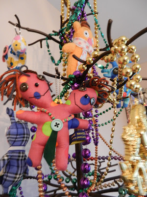 Now fast forward one year, to February 2012. We couldn't return to New Orleans, so we celebrated Mardi Gras with a small dinner party. I made a voodoo doll tree with the voodoo dolls I'd bought in New Orleans last year.